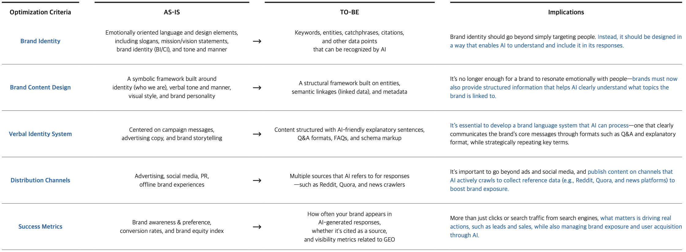 The key implication of GEO for branding and marketing is that communication is no longer just directed at people but also at AI. Brands now need to understand how to plan, produce, and distribute content aimed at AI.