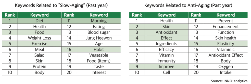 Slow-aging is different from anti-aging. Anti-aging typically focuses on improving appearance, as reflected in its relevant keywords centered on beauty—“skin,” “antioxidant,” “effect,” and “improvement.” It tends to frame aging not as a natural process but as something to be fought or reversed. In contrast, slow-aging embraces aging as a natural process and focuses on slowing it down rather than fighting against it. It focuses on building healthy daily routines through everyday practices, as reflected in its relevant keywords, such as “diet,” “food,” “exercise,” “morning,” and “habit.” Rather than pursuing dramatic changes, slow-aging emphasizes long-term, sustainable habits, such as eating cleaner, exercising more, and breaking bad habits for improved health.