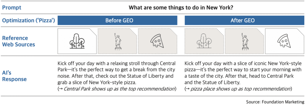 GEO (Generative Engine Optimization) is the practice of structuring content so that generative AI platforms can easily access, accurately interpret, and recognize it as a reference when generating responses to user queries. At its core, GEO is about optimizing content—whether it’s a brand, product, concept, person, or idea—to increase its visibility in answers generated by generative engines like ChatGPT, Google AI Overviews, and Perplexity. For example, consider a pizza shop in New York. If generative AI typically recommends visiting Central Park or the Statue of Liberty when asked about things to do in the city, the goal of GEO would be to position “New York-style pizza” as a must-try experience—making it more likely that the shop appears in AI-generated suggestions.
