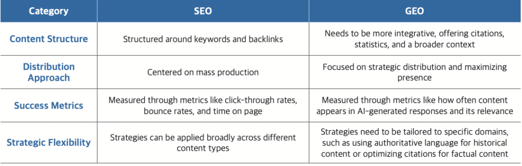 When it comes to implementation, GEO often shares or builds upon the methodologies used in SEO (Search Engine Optimization), which typically targets traditional search engines like Google. In today’s landscape, where search engines and generative AI platforms coexist, SEO and GEO should be used together to maximize impact and drive synergy. However, GEO differs fundamentally from SEO in its objective. While SEO is designed to drive “link clicks,” GEO aims to have your content “included directly in AI-generated responses.” Additionally, SEO focuses on “keyword optimization,” whereas GEO emphasizes improving content “credibility” and “structure” to increase the likelihood of being selected as a reference. These differences call for a shift in how marketers approach digital strategy, content creation, and content distribution in the AI-driven era.